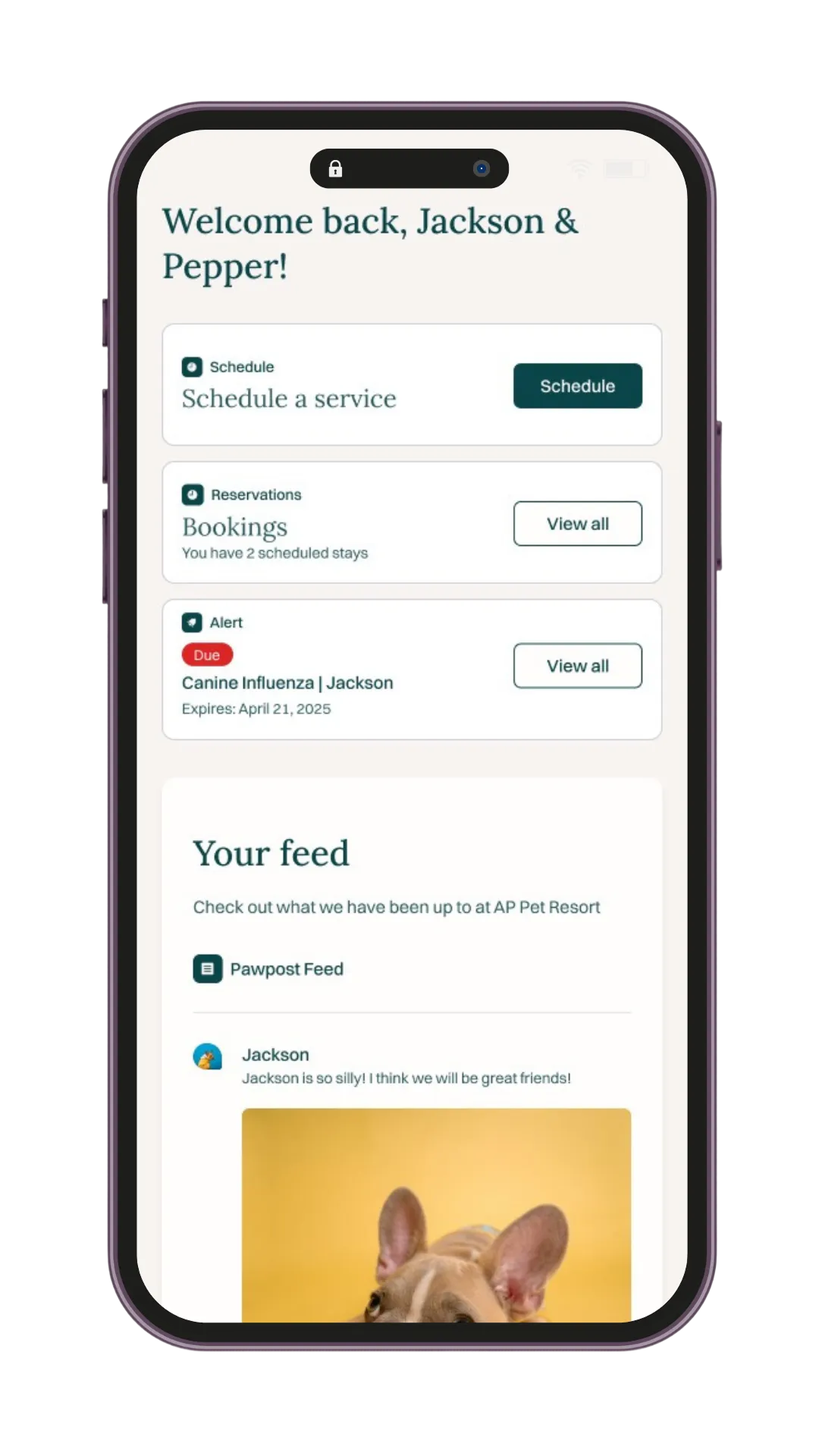 Clients manage their pet's profiles, schedule services, and recieve automated updates while your team focuses on care and daily operations.